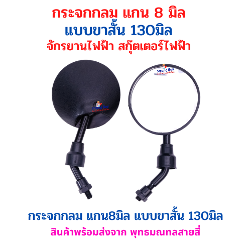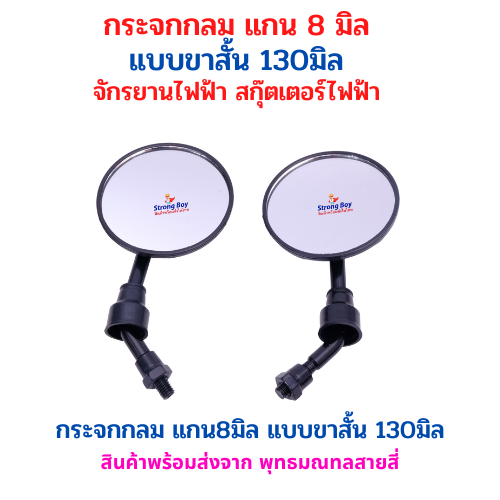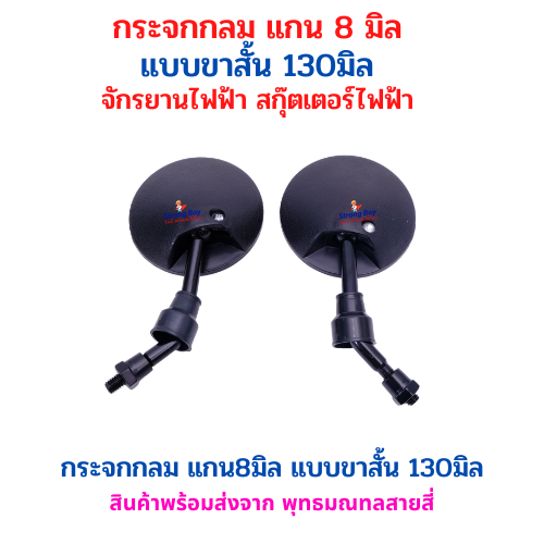 รายละเอียดสินค้า (Description): กระจกมองข้างทรงกลม สำหรับติดตั้งกับจักรยานไฟฟ้าและสกู๊ตเตอร์ไฟฟ้า ออกแบบให้มุมมองชัดเจน ช่วยเพิ่มความสะดวกในการมองด้านหลัง ขนาดแกน 8 มิลลิเมตร แบบขาสั้นความยาว 130 มิลลิเมตร โครงสร้างแข็งแรง ใช้งานได้หลากหลายรุ่น ติดตั้งง่าย เหมาะสำหรับผู้ใช้งานทั่วไป